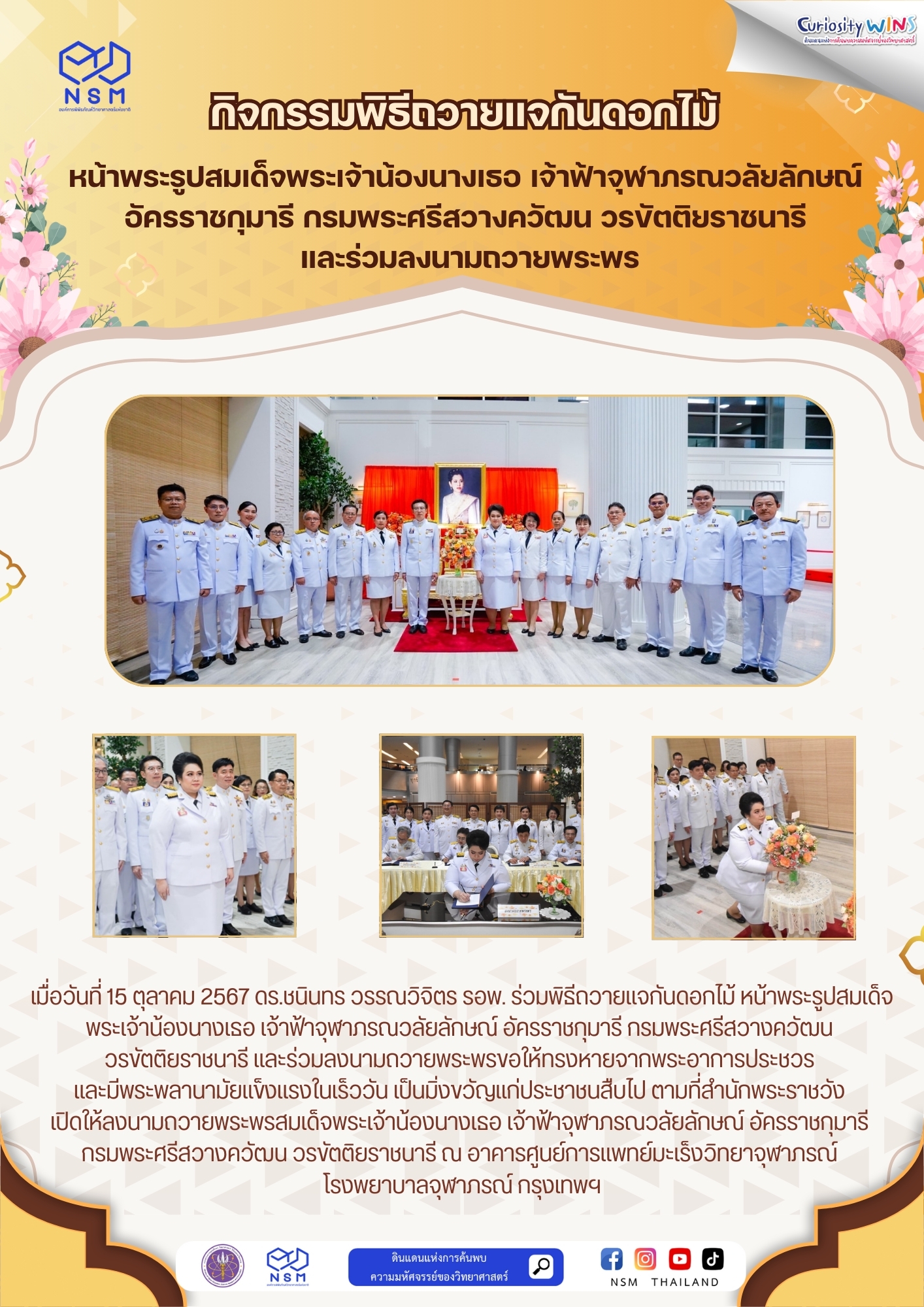 กิจกรรมพิธีถวายแจกันดอกไม้ หน้าพระรูปสมเด็จพระเจ้าน้องนางเธอ เจ้าฟ้าจุฬาภรณวลัยลักษณ์ อัครราชกุมารี กรมพระศรีสวางควัฒน วรขัตติยราชนารี และร่วมลงนามถวายพระพร